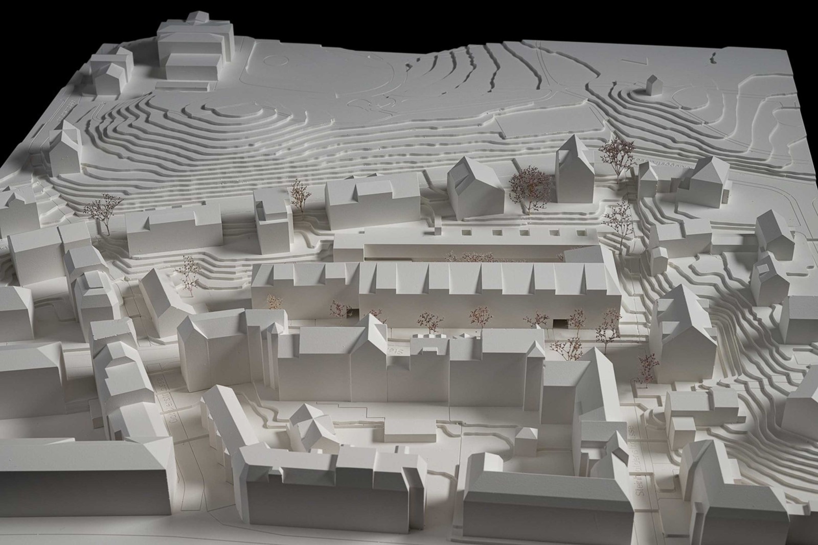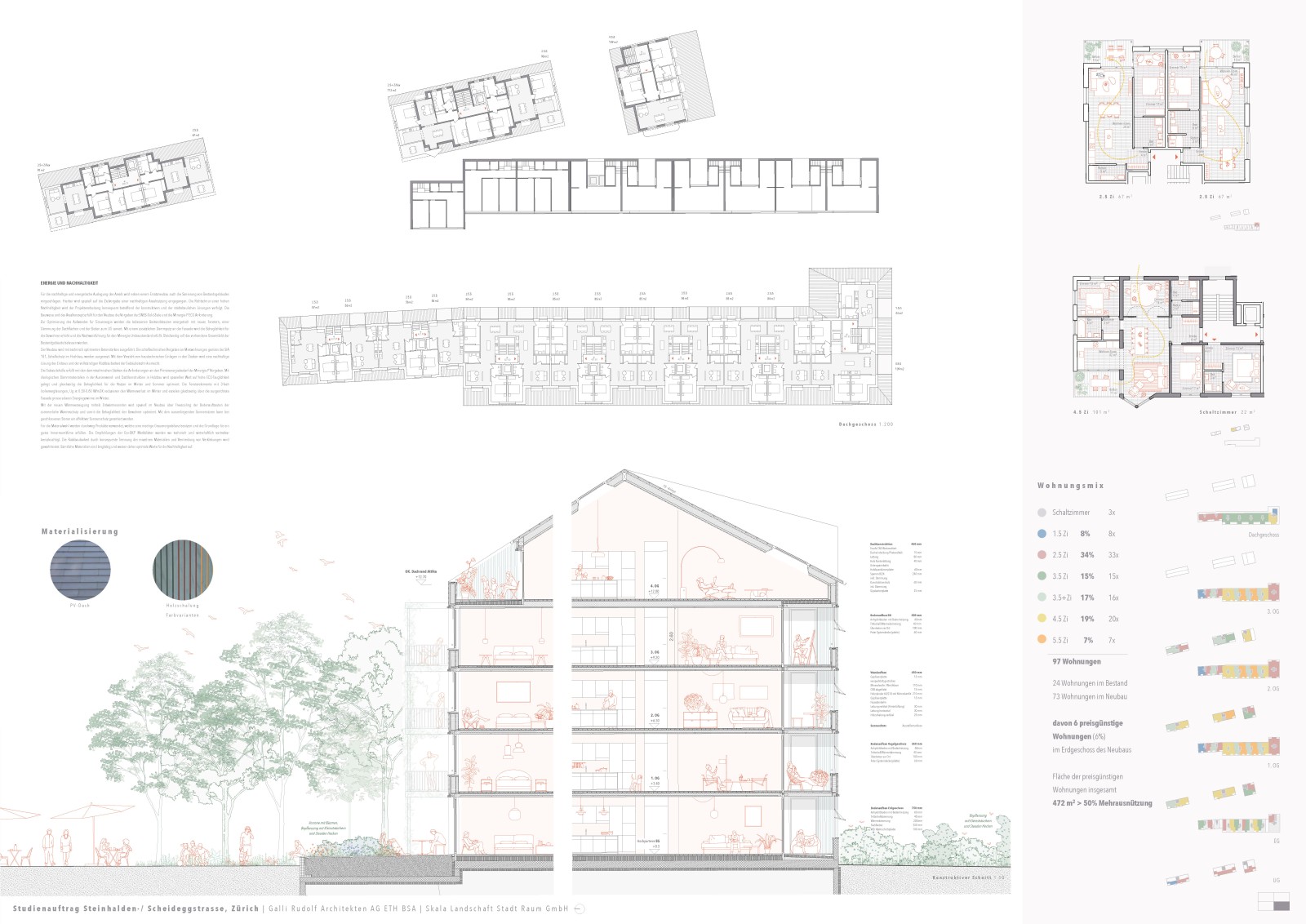 Mit dem Erhalt der drei oberen Bauten an der Scheideggstrasse und der Setzung eines eines figuralen Langhauses zwischen Steinhaldenstrasse und Hof entsteht eine spannungsvolle austarierte Volumenverteilung. Durch die gezielte Kombination aus dem Erhalt der drei oberen Bauten an der Scheideggstrasse und einem figuralen Langhaus zwischen Steinhaldenstrasse und Hof entsteht ein volumetrisch austariertes spannungsvolles Ensemble. Das neue Langhaus vermittelt zwischen Hof und Strasse, stärkt den Quartiersplatz und reagiert sensibel auf den Kontext. Zum Platz hin entsteht durch die markante Kopfbildung und öffentlich zugänglichen Erdgeschossnutzungen – im Zusammenspiel mit dem barocken Patrizierhaus «Brunnenhof» – ein angemessener Auftritt.Die Einzelbauten entlang der Scheideggstrasse gewähren den räumlichen Bezug zum Rietbergpark. Eine einheitliche Dachlandschaft verbindet Alt und Neu zu einem kohärenten Ganzen.