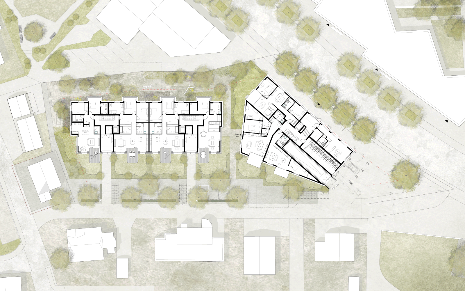 Das Projekt mit zwei unterschiedlichen Wohnhäusern vermittelt zwischen der kleinkörnigen Bebauung entlang des Sonnenwegs und den grossmassstäblichen Strukturen an der Zürcherstrasse. In Setzung, Höhenentwicklung und Ausformulierung der Baukörper entsteht ein austarierter Übergang, der die bestehende Umgebung respektiert und städtebauliche Impulse zur angestrebten Entwicklung eines lebendigen Zentrums mit urbaner Dichte setzt. Es entstehen zwei kontrastierende Welten, welche mit einer dörflichen Wiche verbunden sind. Zur exponierten Zürichstrasse entsteht eine eher geschlossene städtische Fassade, zum Sonnenweg entsteht durch die leichte Abdrehung eine Raumfassung des des intensiv bespielten Gartenraums.