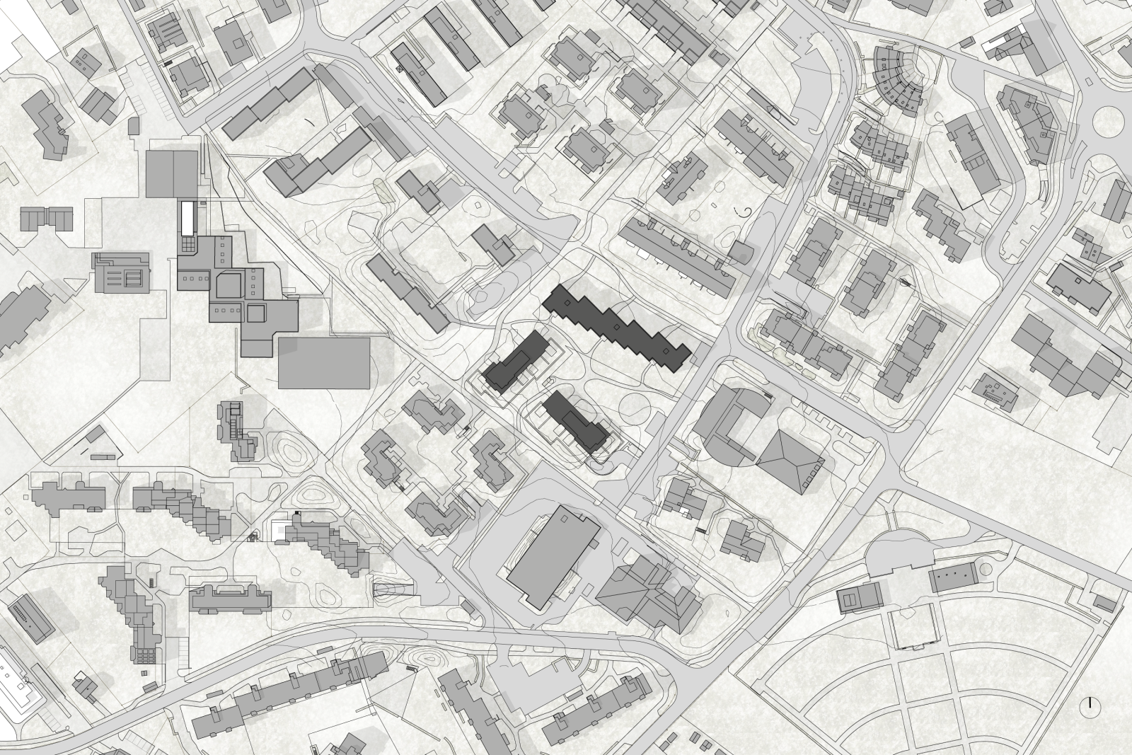 Mit dem Teilersatz wird das auf sich selbst bezogene Siedlungsmuster zu Gunsten von parzellenübergreifenden Freiraumbezügen aufgebrochen. Ein gestaffelter kettenartig aufgebauter Neubau wird parallel zur Grundstücksgrenze und mit der Stirnfassade zur Langfurrenstrasse situiert. Die beiden nordöstlichen Bauten bleiben bestehen und werden erneuert. Der neue geöffnete Hof wird Orientierungspunkt und Anker im Siedlungspatchwork von Wetzikon. Der Esprit des offenen Raumes wird in eine urbanistische Parklandschaft transformiert, welche Assoziationen zu weiten Parklandschaften hervorrufen.