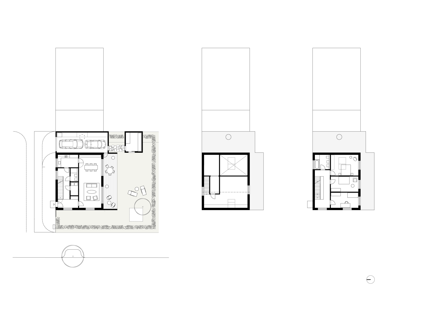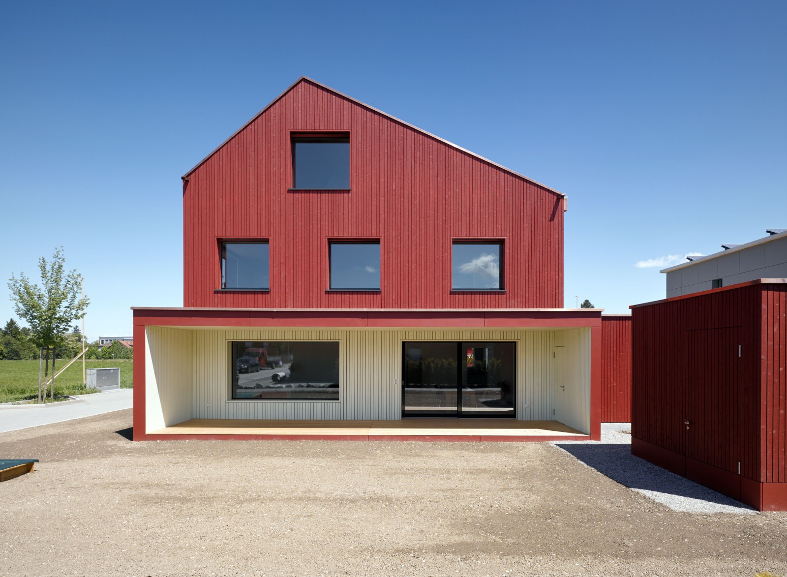 Das Haus für eine Sängerfamilie befindet sich in einem neuen, in verdichteter Bauweise erstellten Wohnquartier und wurde somit gemäss Gestaltungsplan über einen Zwischenbau mit Garage und Geräteschuppen an das Nachbarhaus angebaut. Durch die asymmetrische Setzung des Giebelfirsts und die innere Schnittentwicklung, welche die Geschossigkeit aufbricht und an der Setzung der grossen Fenster erahnbar ist, wird eine kristalline und abstrakte Wirkung erzielt. Der einfachen, klaren Grundrisstypologie mit einer einläufigen Treppe steht ein komplexes Innenleben mit einem in den Dachraum greifenden überhohen Elternschlafzimmer und einem Musikzimmer unter Dach gegenüber. Der Aussenraumbezug wird im Erdgeschoss über eine sich auf der ganzen Länge erstreckende Veranda hergestellt, welche in den Baukörper integriert ist. Die Konstruktion besteht aus Holzsystemelementen, die mit einer rot gestrichenen Fichtenlattung verkleidet wurden. Auf eine Unterkellerung wurde aus Kostengründen verzichtet.
