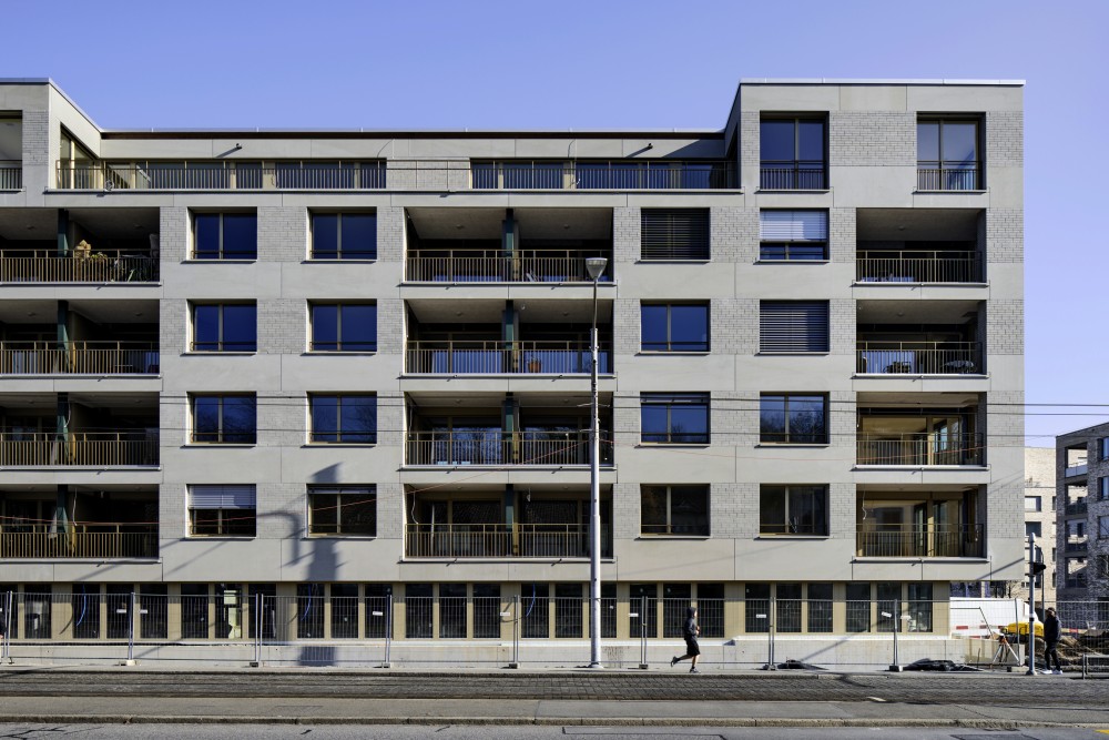 Das Wohnhaus der Genossenschaft «Sunnige Hof» befindet sich im Zürcher Aussenquartier Schwamendingen, welches einem starken Verdichtungs- und Transformationsprozess unterliegt. Für den Ersatzneubau an der verkehrsbelasteten Dübendorfstrasse wurde eine zwischen den heterogenen Massstäben im Kontext vermittelnden Baukörper mit klarer Adressbildung zur Dübendorfstrasse entwickelt. Der Baukörper zeichnet die spezielle Grundstücksform nach und wird in einen strassenbegleitenden Längsbaukörper und in ein fein abgestuftes Hof- und Gartenhaus gegliedert. In den beidseitigen Gartenhöfen entsteht vertraute Kleinmassstäblichkeit. |
