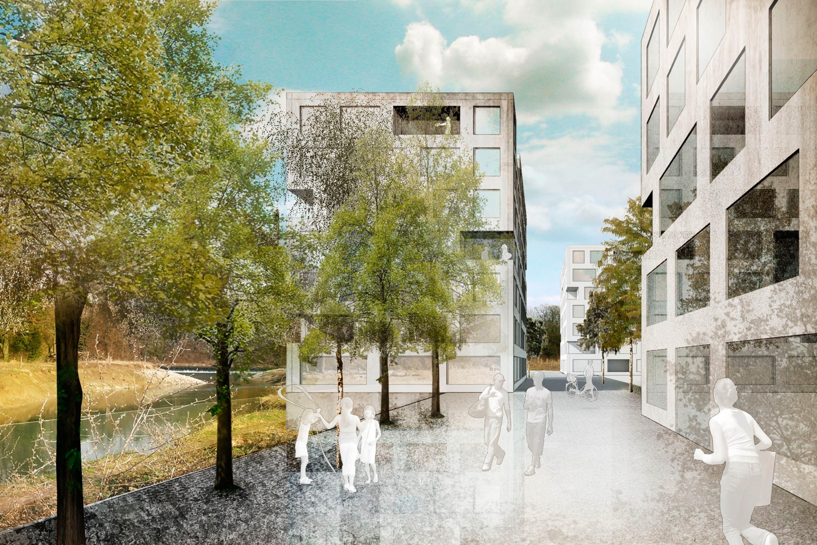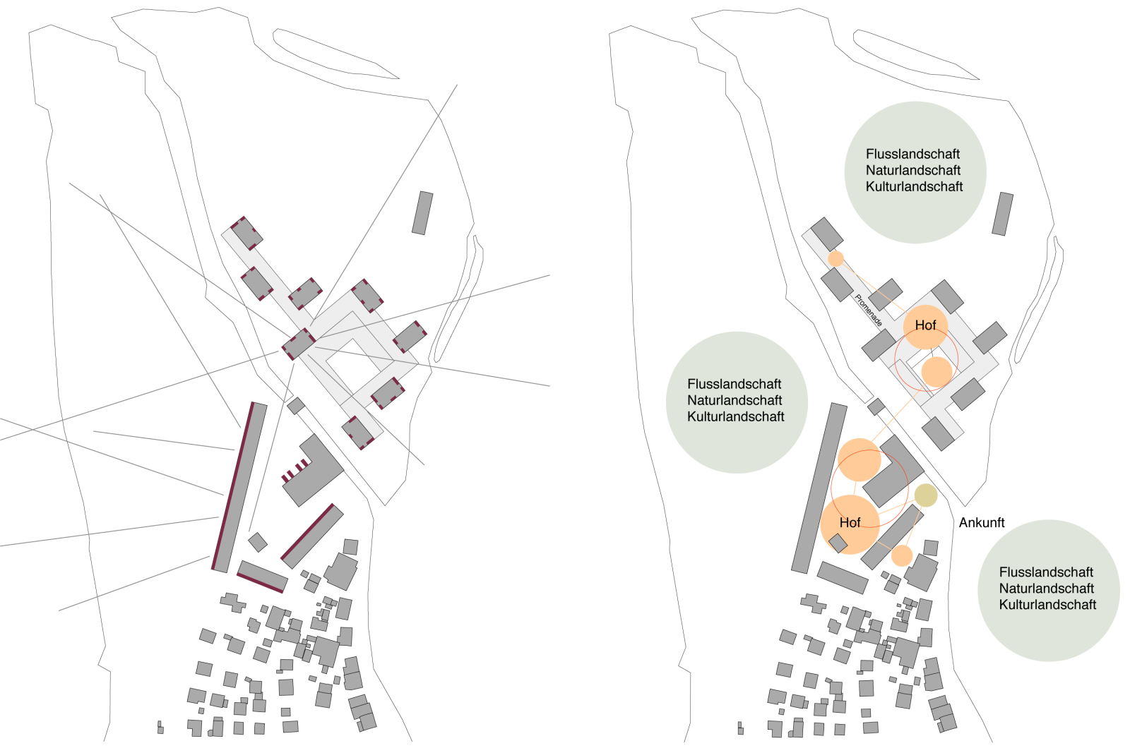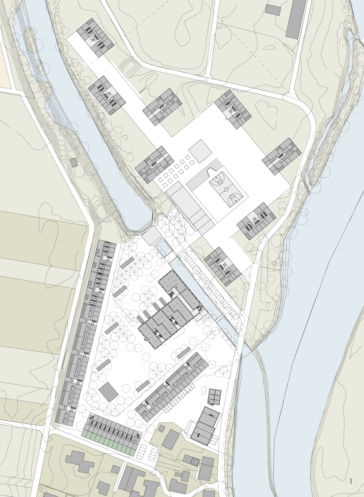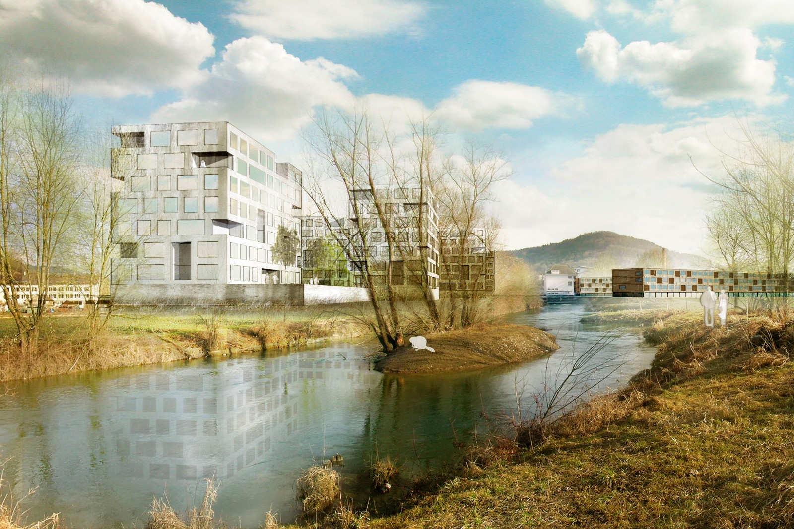 Das ehemalige Fabrikationsareal der Leuchtenfabrik BAG liegt unmittelbar im sogenannten Wasserschloss, dem Mündungsgebiet von Aare, Reuss und Limmat. Das Areal befindet sich im Hochwasser-Gefahrenbereich und inmitten der als Aue und Landschaft von nationaler Bedeutung ausgezeichneten Flusslandschaft. Das städtebauliche Konzept geht davon aus, dass das Areal im Inneren eine urbane Dichte mit einer klaren Abgrenzung zur offenen Landschaft erfahren soll. Dabei bleiben Fussabdruck und Massstab der industriellen Spuren lesbar. Im südlichen und im nördlichen Arealteil sind die Räume komplementär ausgebildet. Im Südareal formen längliche, an serielle frühindustrielle Wohnbauformen erinnernde Baukörper gemeinsam mit dem bestehenden Hauptgebäude einen Hof. Im Nordareal schafft eine sich konvex-konkav bewegende Sockelebene eine Grenze und Schutz gegen das Hochwasser sowie eine Aussichtsplattform zur Landschaft.