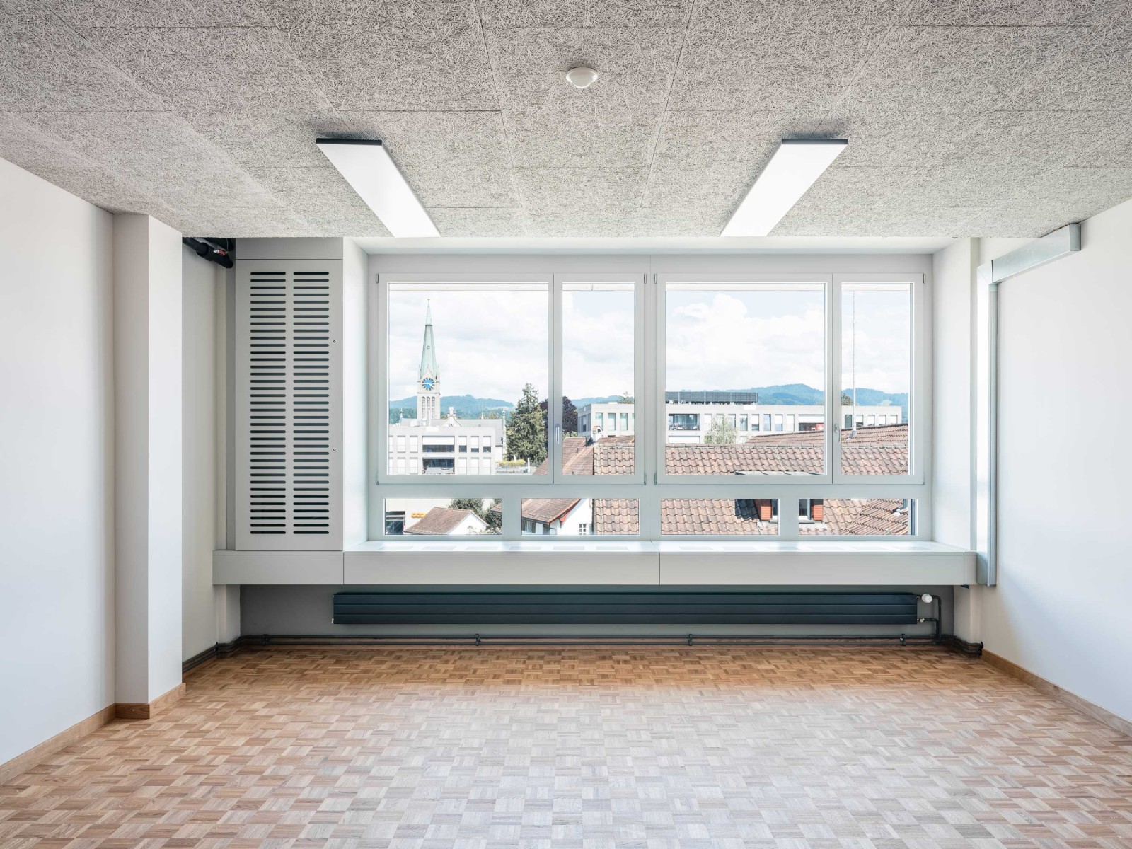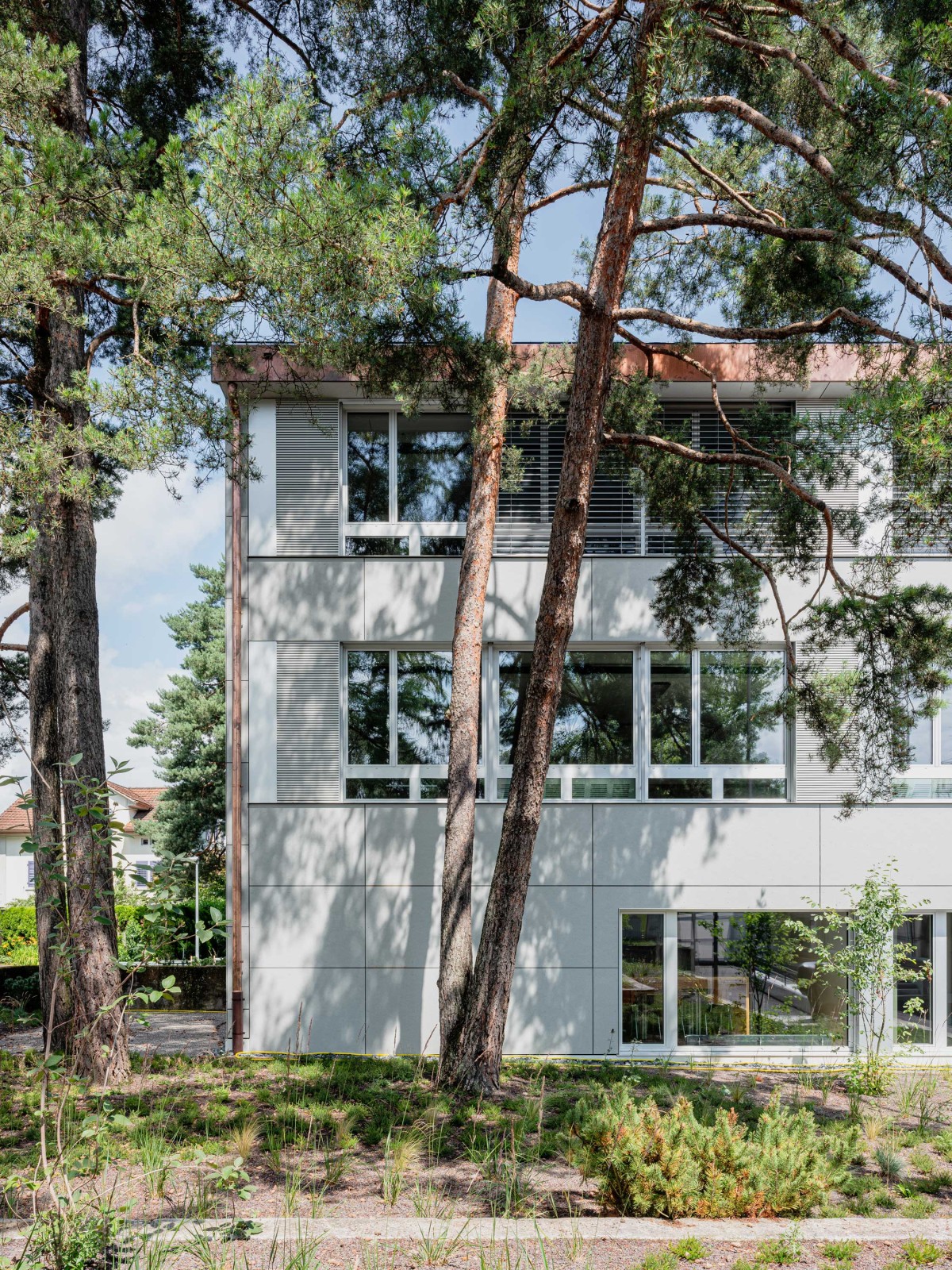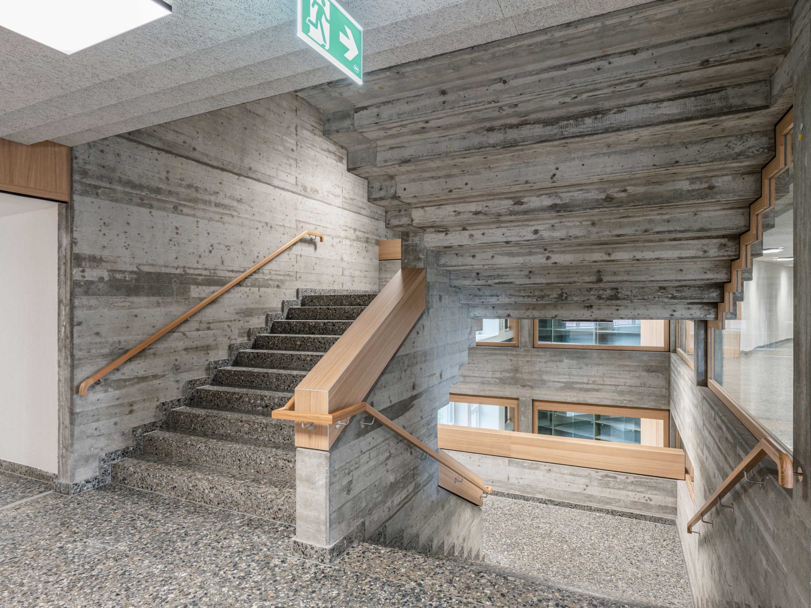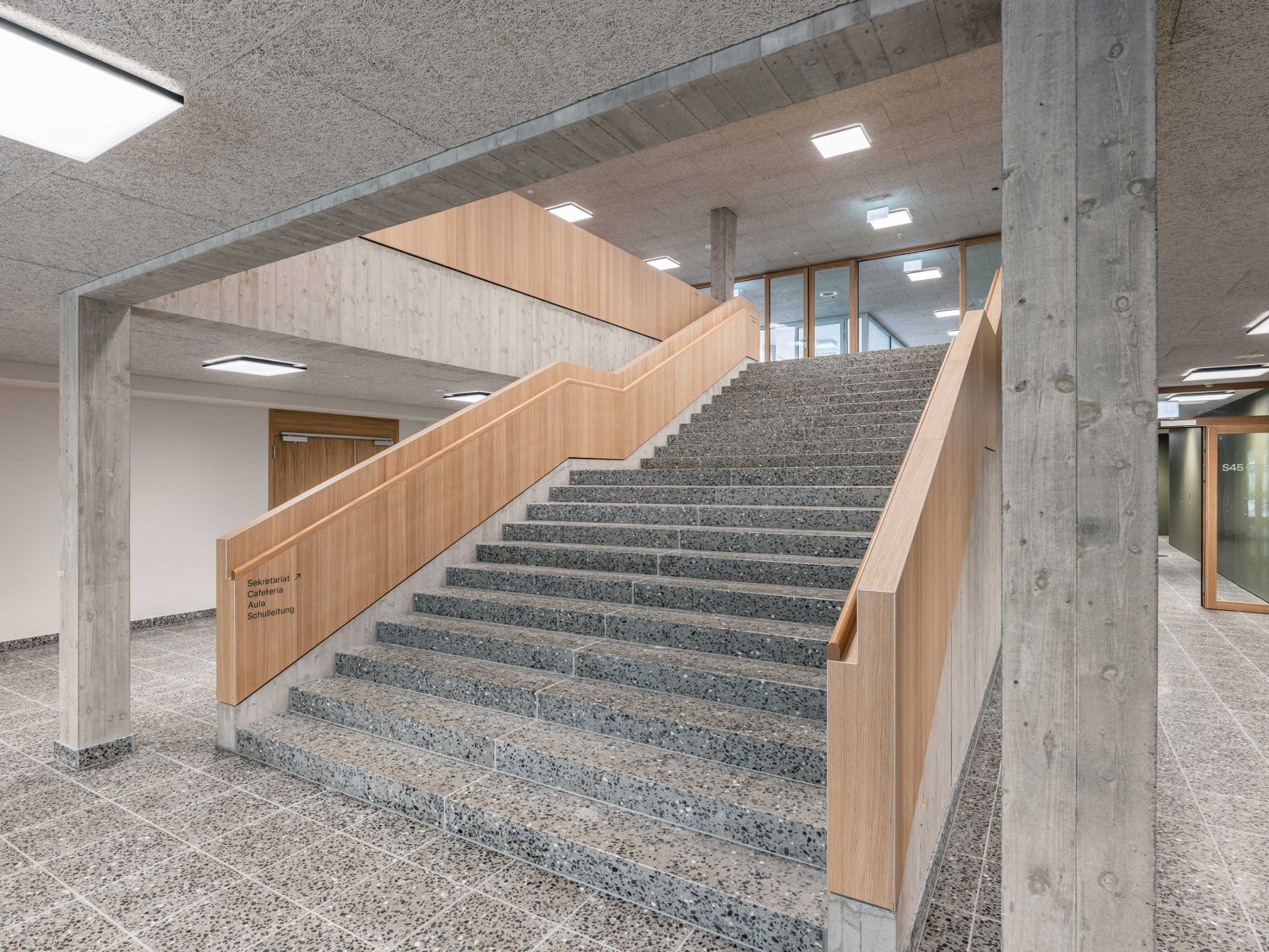 Die energetische Erneuerung der Gebäudehülle bot die Chance, aus dem heterogenen Konglomerat der verschiedenen Gebäude durch die Vereinheitlichung der Fassaden bis zu den Profilen ein kraftvolles figurales Ganzes zu kreieren. Die Fassaden sind aus hellgrauen hinterlüfteten Faserzementplatten, die Fensterprofile und Lüftungsgitter aus gleichfarbigem Aluminium. Auch die inneren Oberflächen sind robust und beständig. Die Farbigkeit ist geprägt durch die in den Korridoren partiell ergänzten Kunststeinplatten und die hölzernen Klötzliparkettböden in den Unterrichtszimmern. Die tragenden Betonwangen aus Sichtbeton sind im Bereich der Handläufe mit markanten Einfassungen in Eichenholz kombiniert. Die Deckenakustik aus zementgebundenen Holzwollplatten ist unverblümt und direkt wie die aufgesetzten schlichten Deckeckenleuchten in den Klassenzimmern.