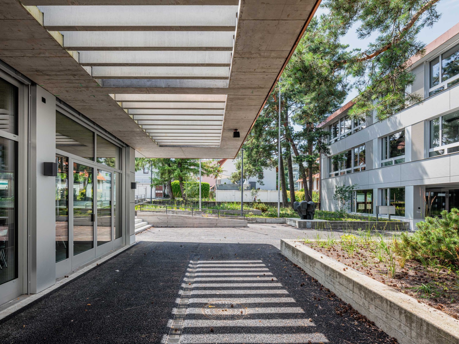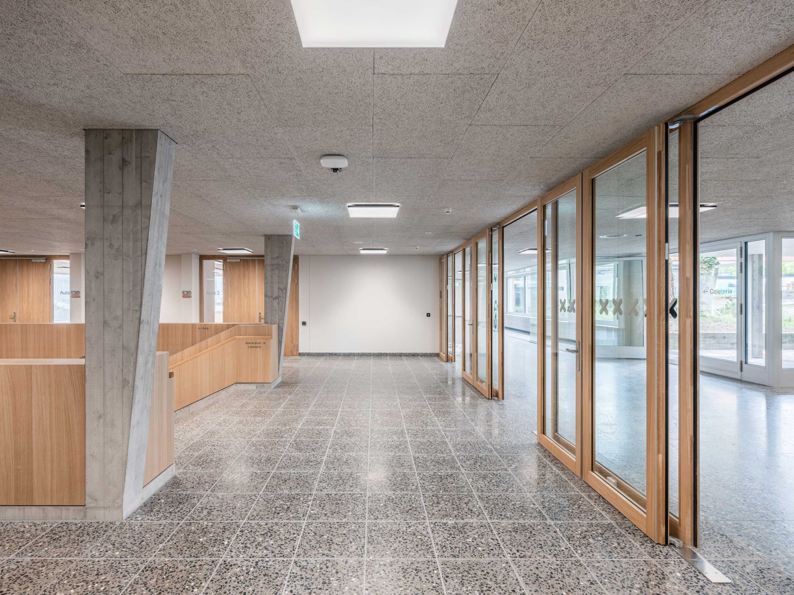 Die Auslagerung der Mensa und Küche in einen Erweiterungsbau gab den Spielraum, die beiden Zugangsniveaus neu zu gewichten und über eine geradlinige breite Treppe miteinander übersichtlich und weiträumig zu verbinden. Der baumbestandene Vorbereich an der Gewerbeschulstrasse bekommt durch die neue Mensa eine räumliche Fassung und bildet einen willkommenen Erholungs- und Pausenraum im Freien. Mit den Rückbauten im Sockelgeschoss konnte auf der Seite Tödistrasse zu den Bushaltestellen eine neue Adresse mit einem angemessenem Aussenbereich etabliert werden. Im Innern behält die bestehende skulpturale Treppe als Schnellverbindung der Klassengeschosse weiterhin ihre tragende Funktion.