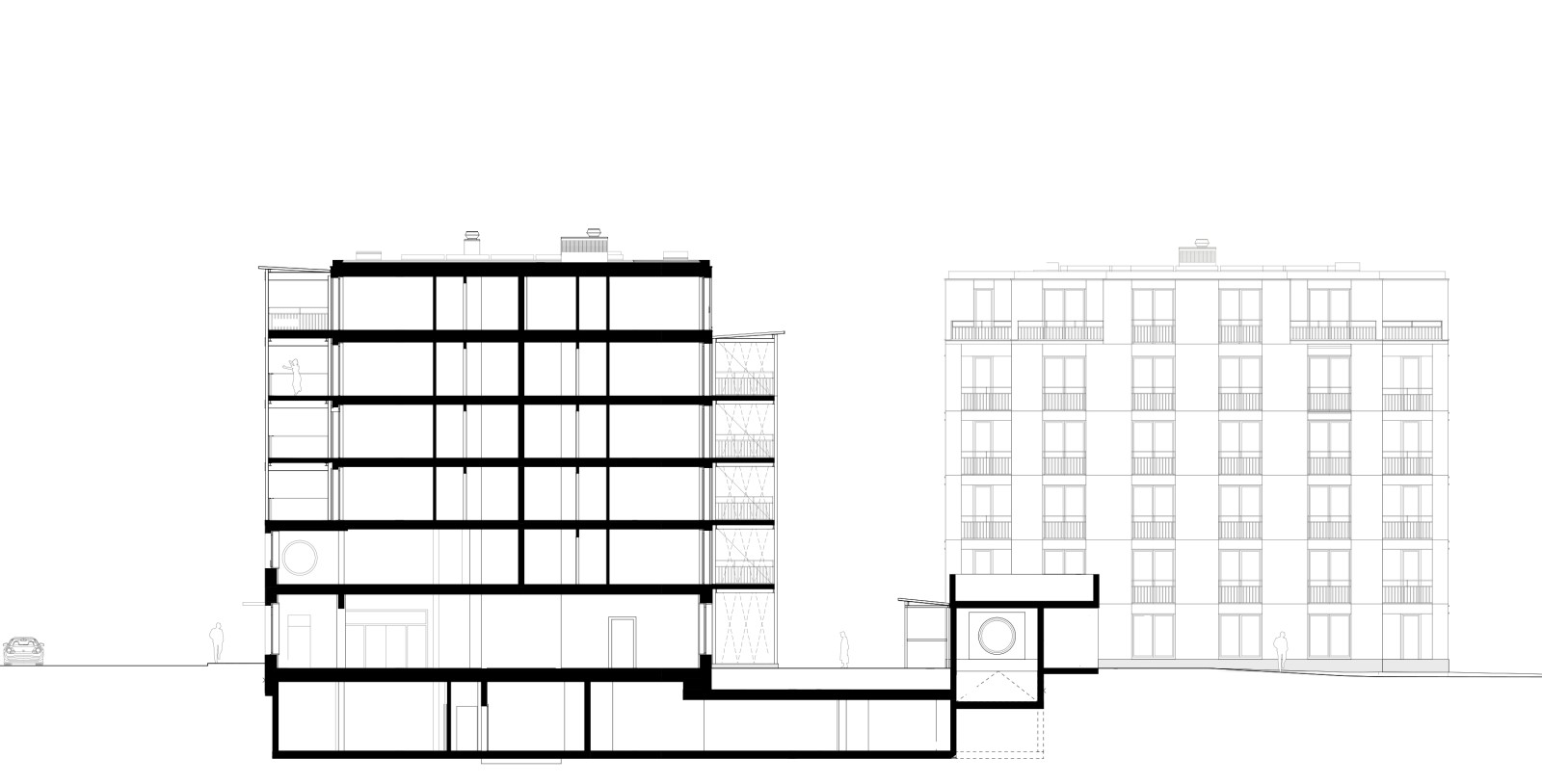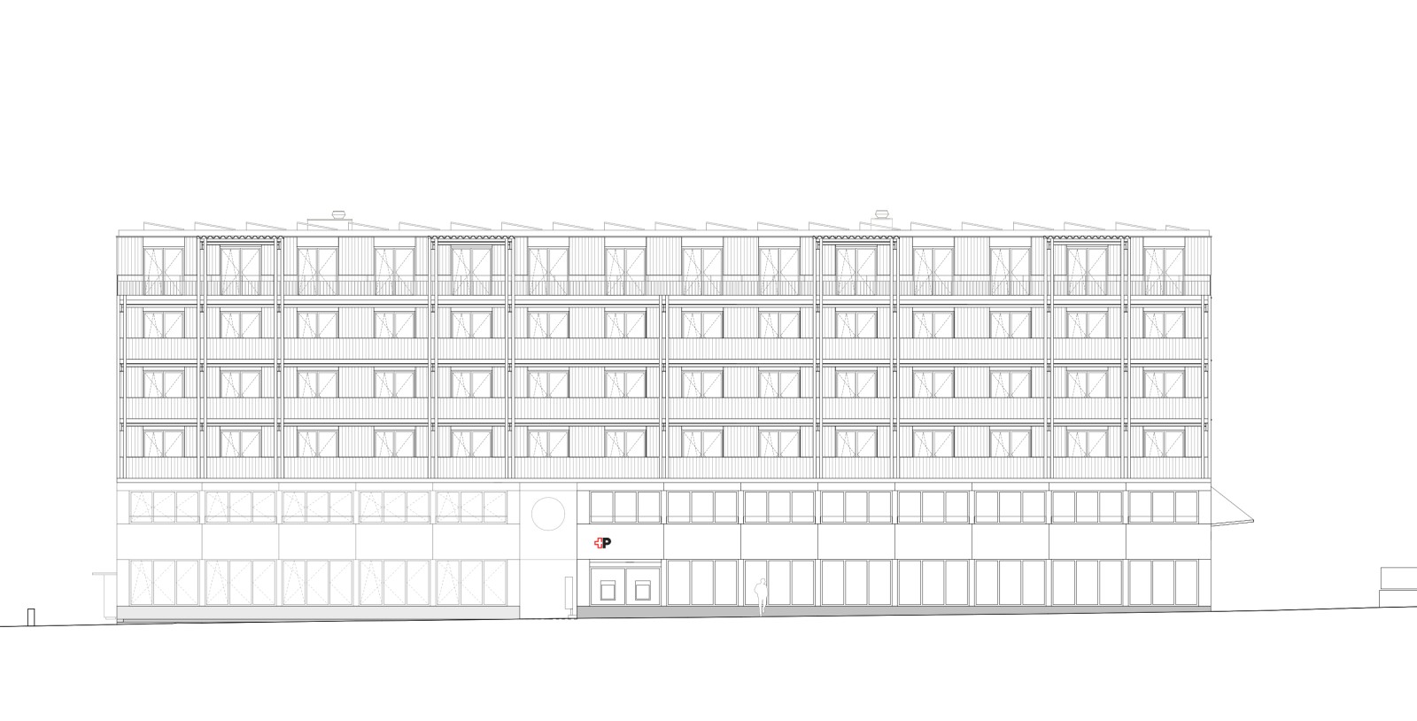 Der zweigeschossige Sockelbereich mit der erdgeschossige Posthalle und gewerblichen Nutzungen schafft einen markanten Auftritt zur Altstetterstrasse. Zum Lindenplatz entsteht durch den zweigeschossigen Rückzug der Fassade ein Vorplatz und räumliche Geste. Der Durchgang verbindet und vernetzt die beiden Raumwelten Strasse und Wohnhof und belebt den Charakter des Erdgeschosses.
