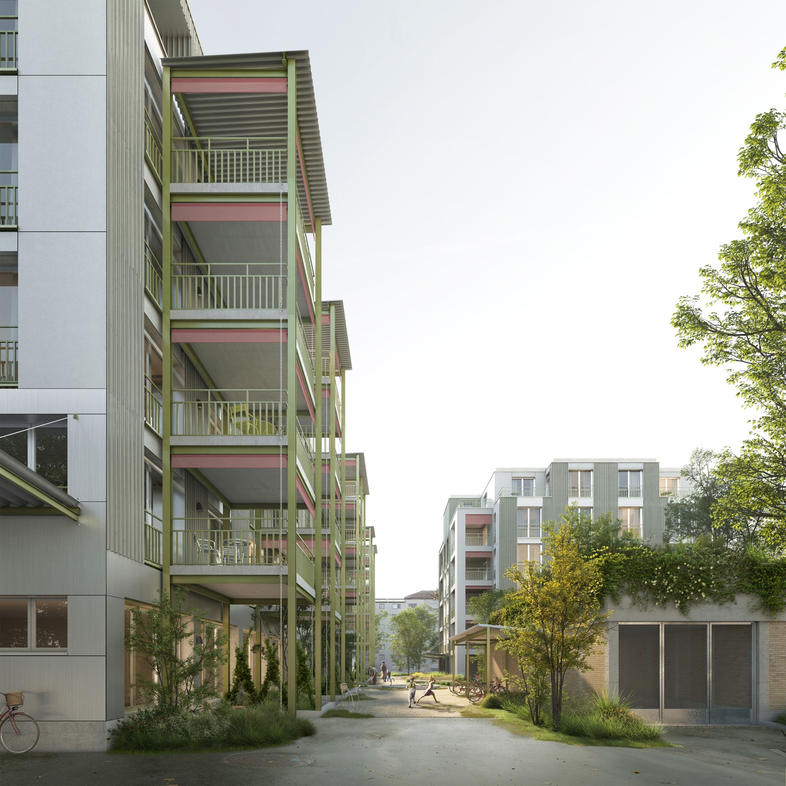 Zur Altstetterstrasse werden die Wohnungen durch eine vorgelagerte Loggiaschicht mit transparenter Brüstung abgeschirmt. Die Bekleidung mit vorgehängten leichten Fassadenplatten erfolgt nach einem austarierten Farb- und Materialkanon, welcher die einzelnen Elemente artikuliert und in eine ausgewogene Gesamterscheinung bringt.