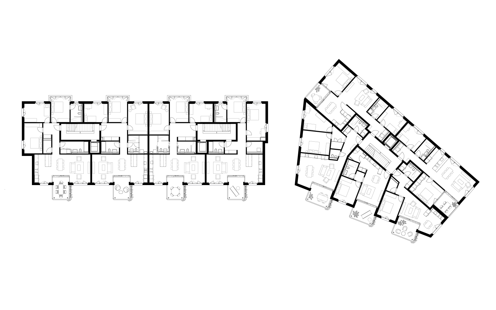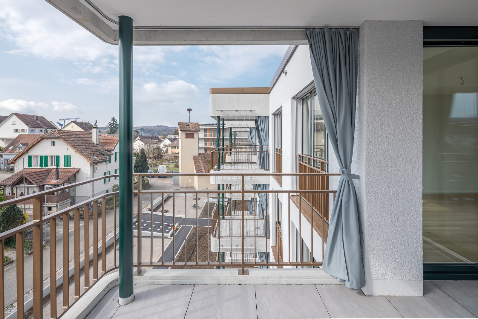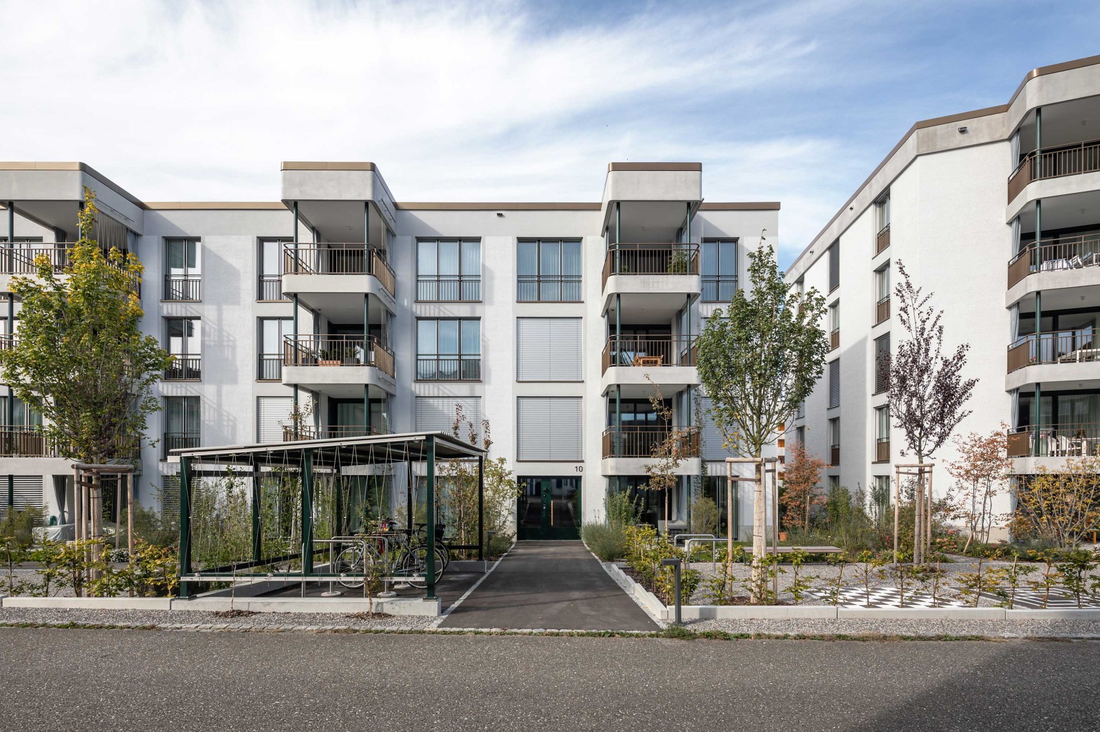 Die Fassaden nach Süden werden über beide Baukörper über regelmässig gesetzte Balkone rhythmisiert, während die Nordseite mit vorgelagerten Gartenzimmern gegliedert ist. Diese Elemente verfeinern die Volumen und verleihen eine wohnliche Anmutung. Der südseitige zusammenhängende Gartenraum bietet eine hohe Aufenthaltsqualität, welche dem Quartier und den Bewohnern dient.