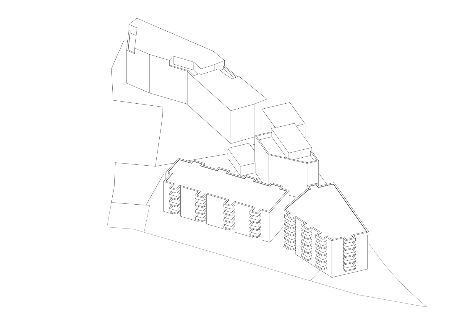 Das Langhaus mit Eigentumswohnungen orientiert sich längs zum Sonnenweg und nimmt dessen Massstäblichkeit auf. Der prägnante fünfeckige um ein Geschoss höhere Gegenspieler mit kleineren Wohnungen formt ein urbanes Passstück zwischen Zürichstrasse und Sonnenweg.