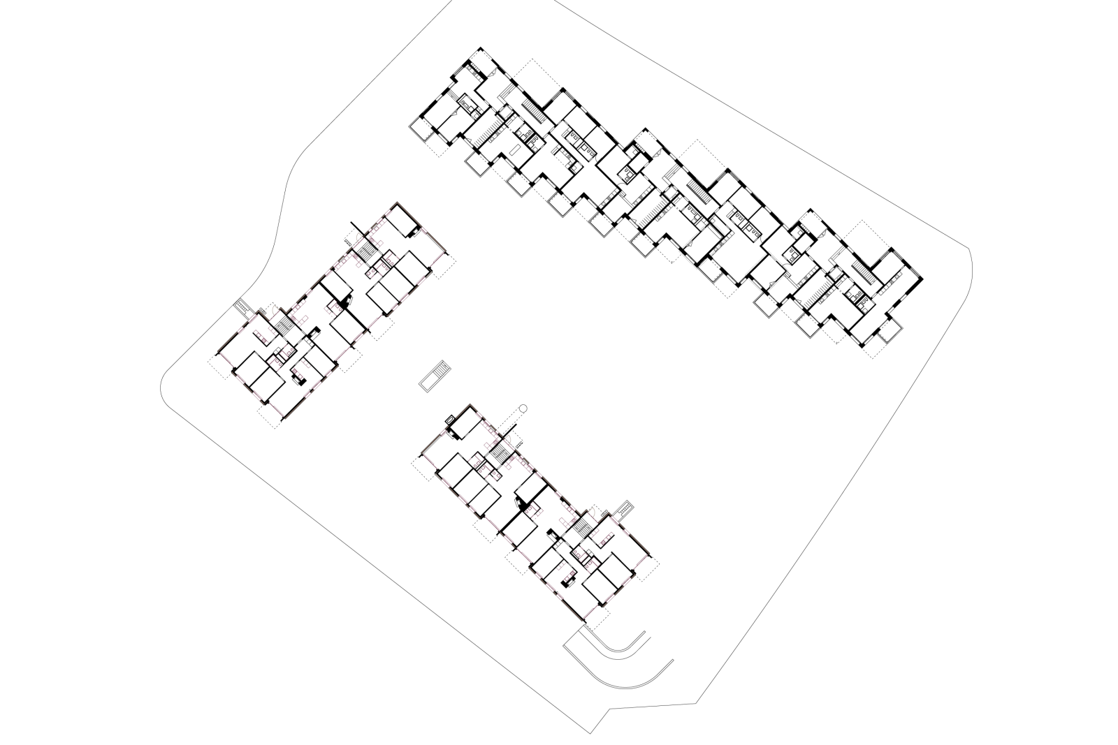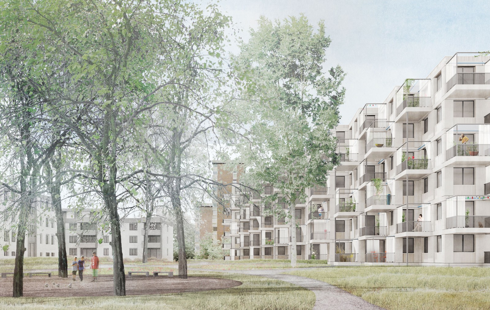 Mit dem Teilersatz wird das auf sich selbst bezogene Siedlungsmuster zu Gunsten von parzellenübergreifenden Freiraumbezügen aufgebrochen. Ein gestaffelter kettenartig aufgebauter Neubau wird parallel zur Grundstücksgrenze und mit der Stirnfassade zur Langfurrenstrasse situiert. Die beiden nordöstlichen Bauten bleiben bestehen und werden erneuert. Der neue geöffnete Hof wird Orientierungspunkt und Anker im Siedlungspatchwork von Wetzikon. Der Esprit des offenen Raumes wird in eine urbanistische Parklandschaft transformiert, welche Assoziationen zu weiten Parklandschaften hervorrufen.