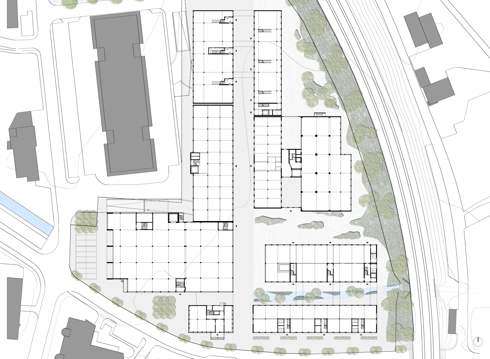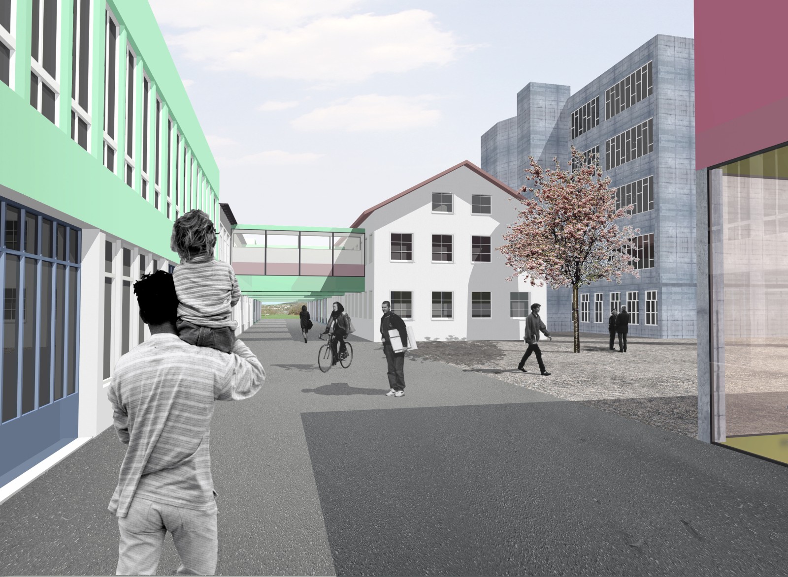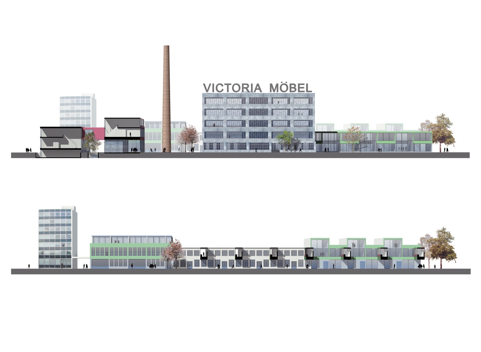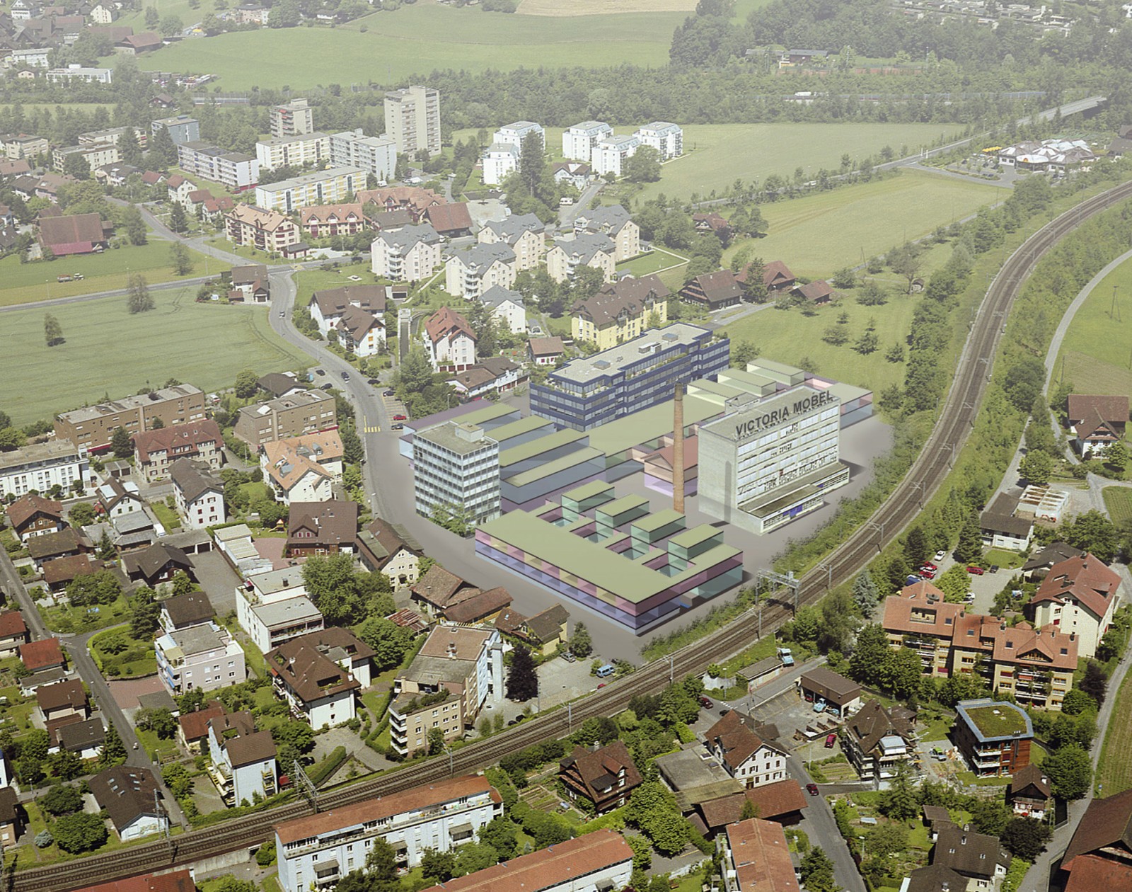 Aufgabe des Studienauftrags war die städtebauliche und nutzungsmässige Entwicklung des stillgelegten Victoria- Areals. Werkhallen, ein monolithischer Verwaltungsbau aus den 1950er Jahren und ein zeichenhafter Bau des Architekten Otto Glaus prägen das Industrieareal. Das Projekt identifizierte das städtebauliche Potential des Bestands mit seiner allseitig kompakten Silhouette. Es setzte auf die Mischung von nutzungsflexiblen Strukturen und einzelnen, spezifisch für diesen Ort zugeschnittenen Bautypen, welche aus dem Fundus des Ortes ihre Einzigartigkeit erhalten. Im Sinn einer offenen Entwicklung sollen die heutigen Gewerbenutzungen neben zeitgemässem Wohnen weiterbestehen. Statt objekthafter Neubauten entstehen flächige urbane Strukturen, welche das Areal verdichten und im Norden das Wohnen über der Werkstrasse, im Süden das Wohnen über dem Bach thematisieren. Ausgehend vom Typ der zwischen den Werkhallen aufgespannten Passerellen wurden für die Neubaufelder im Norden und im Süden Wohnungstypen mit einer Länge von bis zu 37 m entwickelt. Das Areal orientiert sich nach Innen; aus dem Wechsel von langen, schmalen Zonen, dem zentraleren öffentlicheren Bereich beim bestehenden Kamin und den Randbereichen bis zum Eisenbahndamm und der Obstwiese werden unterschiedlichste Aussenräume geschaffen.