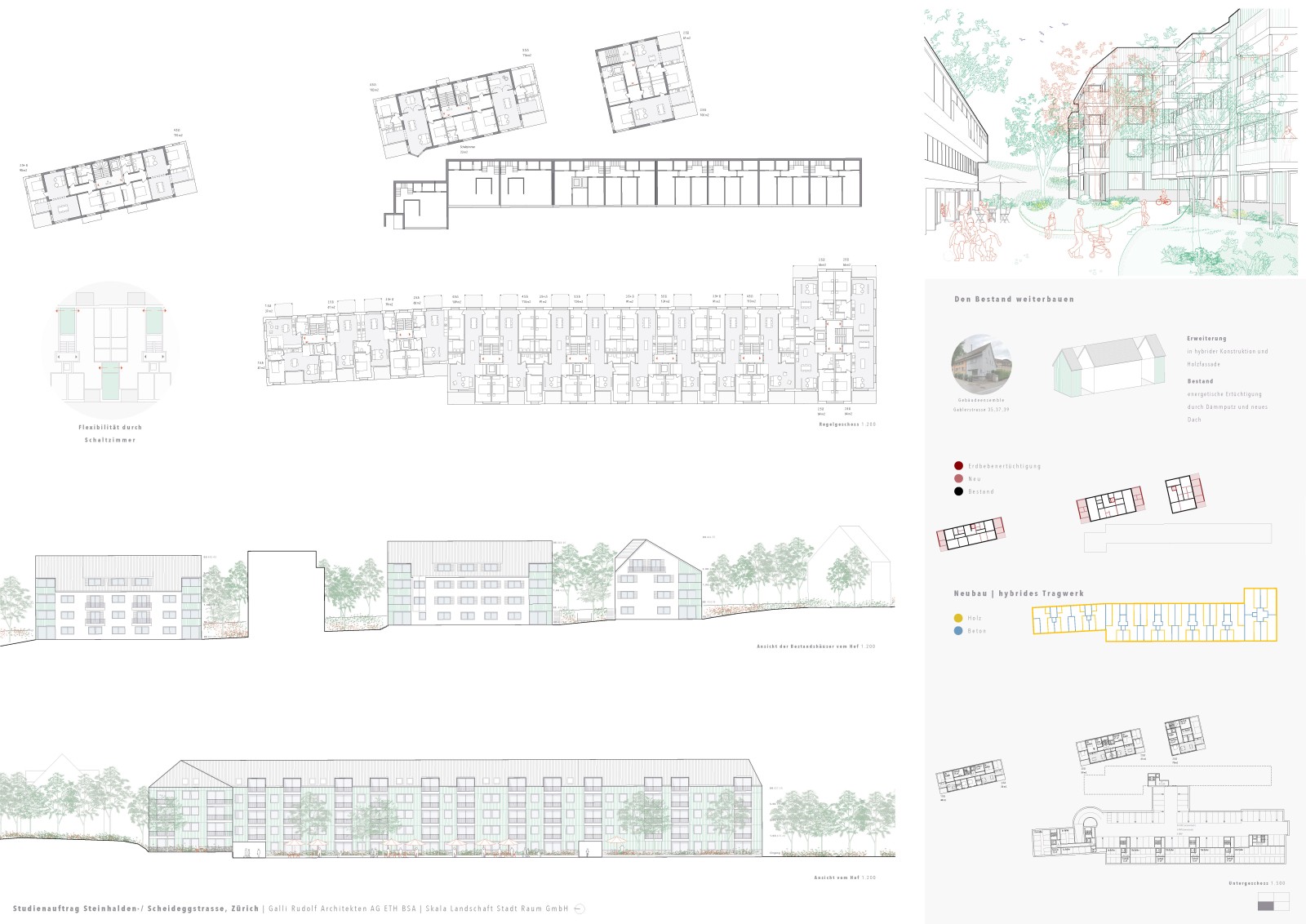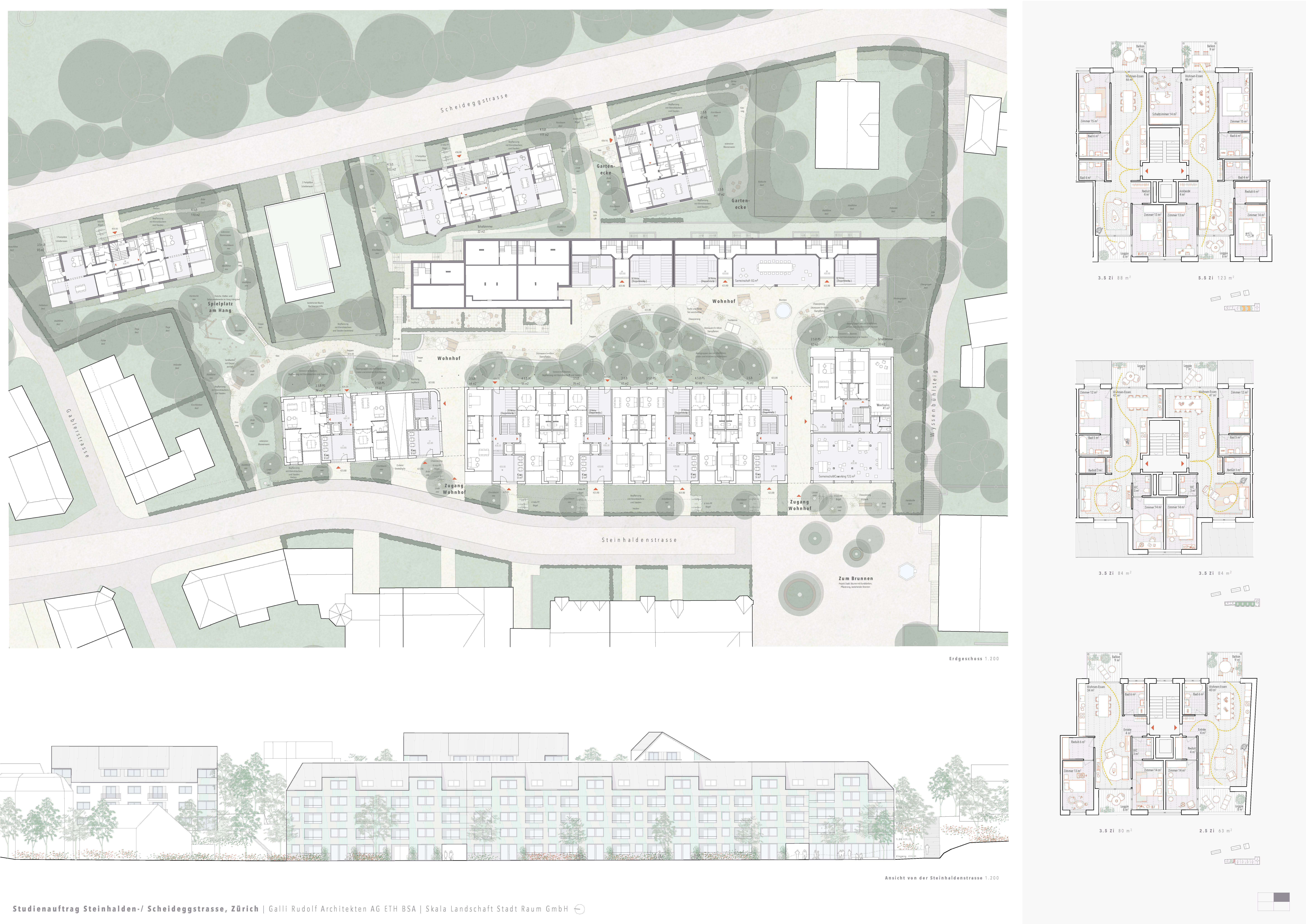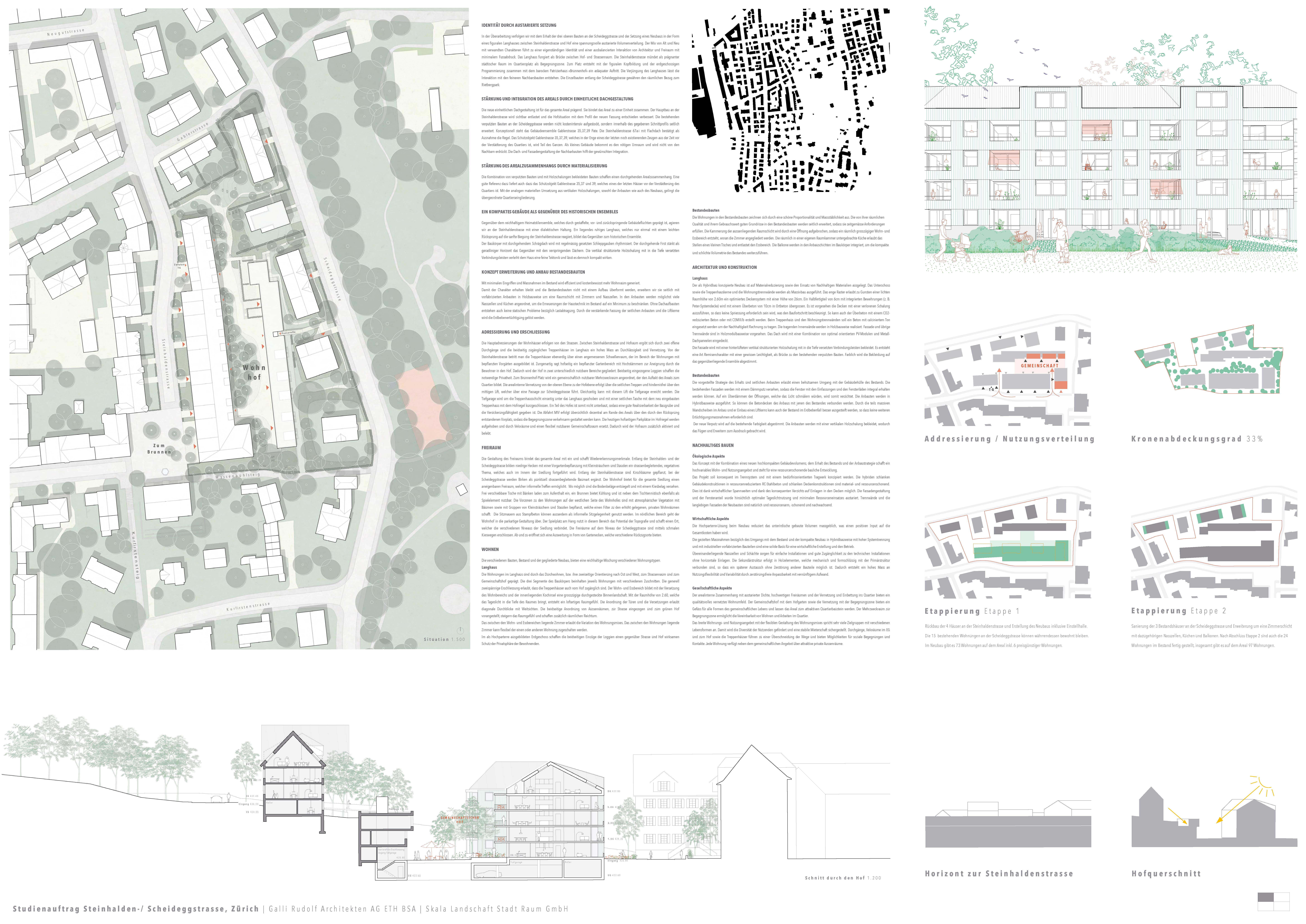 Mit dem Erhalt der drei oberen Bauten an der Scheideggstrasse und der Setzung eines eines figuralen Langhauses zwischen Steinhaldenstrasse und Hof entsteht eine spannungsvolle austarierte Volumenverteilung. Durch die gezielte Kombination aus dem Erhalt der drei oberen Bauten an der Scheideggstrasse und einem figuralen Langhaus zwischen Steinhaldenstrasse und Hof entsteht ein volumetrisch austariertes spannungsvolles Ensemble. Das neue Langhaus vermittelt zwischen Hof und Strasse, stärkt den Quartiersplatz und reagiert sensibel auf den Kontext. Zum Platz hin entsteht durch die markante Kopfbildung und öffentlich zugänglichen Erdgeschossnutzungen – im Zusammenspiel mit dem barocken Patrizierhaus «Brunnenhof» – ein angemessener Auftritt.Die Einzelbauten entlang der Scheideggstrasse gewähren den räumlichen Bezug zum Rietbergpark. Eine einheitliche Dachlandschaft verbindet Alt und Neu zu einem kohärenten Ganzen.