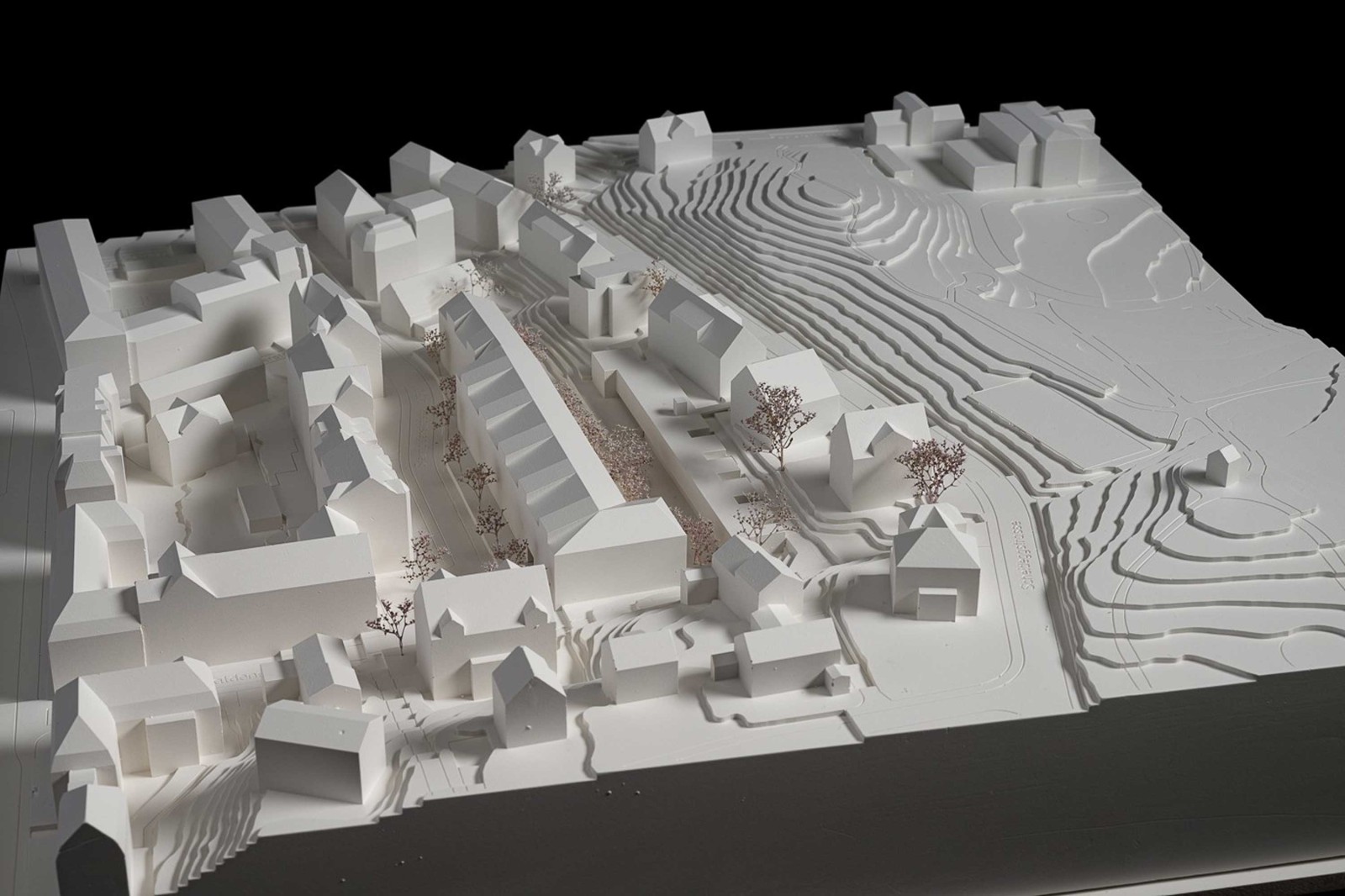 Die Materialwahl – Putz und vertikale Holzschalung – unterstützt die Einbindung ins Quartier. Der Neubau tritt als ruhiges, tektonisch fein gegliedertes Volumen dem historischen Ensemble gegenüber und schafft durch seine klare Formensprache einen respektvollen Dialog.